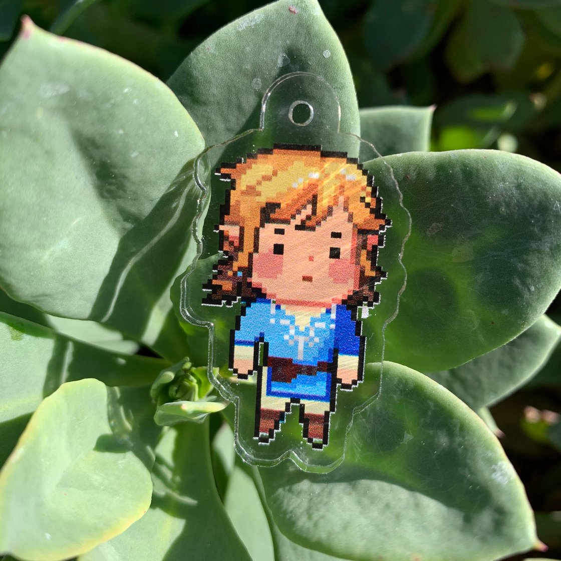 Pixelated Link printed on transparent acrylic, attached with an antique bronze keychain & lobster clasp. Approximately 1in tall. He's small enough to take him on adventures with you!